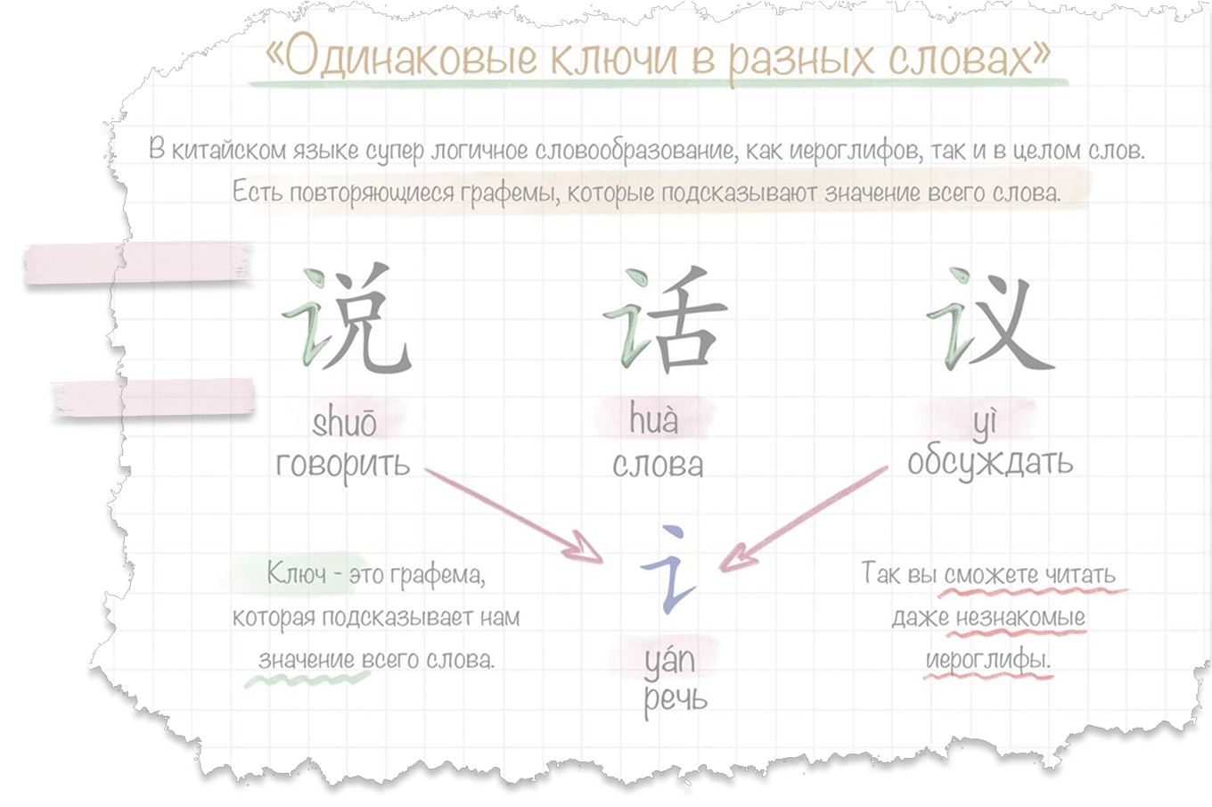 Главный ключ к освоению китайского понимание его логики, а не слепое зазубривание. Поэтому, чтобы вы не учили каждый иероглиф отдельно, со слезами на глазах, мы наглядно покажем взаимосвязи между словами, что в разы ускорит ваше обучение.
